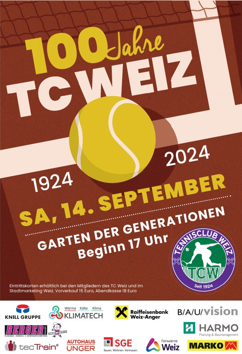 Am Samstag 14.9 ab 17:00 feiern wir im Garten der Generationen 100 Jahre TC Weiz